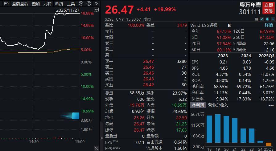 27日,粤万年青(301111)在近乎全天高位震荡后,尾盘突然异动拉升并触及涨停。截至收盘,该股股价收涨19.99%,报26.47元/股华泰国际,收获“两连板”的同时,也创下近两年股价新高。
